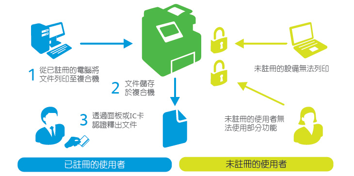 • 使用者認證管理 內(nèi)建權限控管功能可管理至多1000名使用者,文件送出後可先暫存於複合機硬碟中,直至文件所有者於機器上輸入密碼才進行列印。亦可透過原廠內(nèi)嵌式(選購)或外接式讀卡機(選購)進行身份認證,對各使用者可用功能及彩色輸出等權限進行管制。